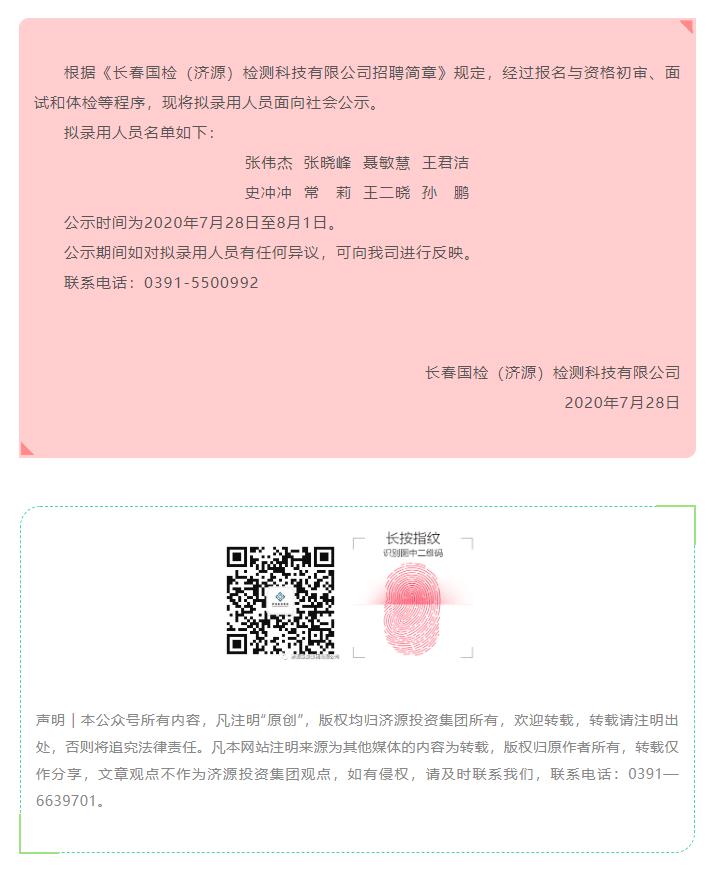 長(zhǎng)春國(guó)檢(濟(jì)源)檢測(cè)科技有限公司人員招聘擬錄用名單公示
