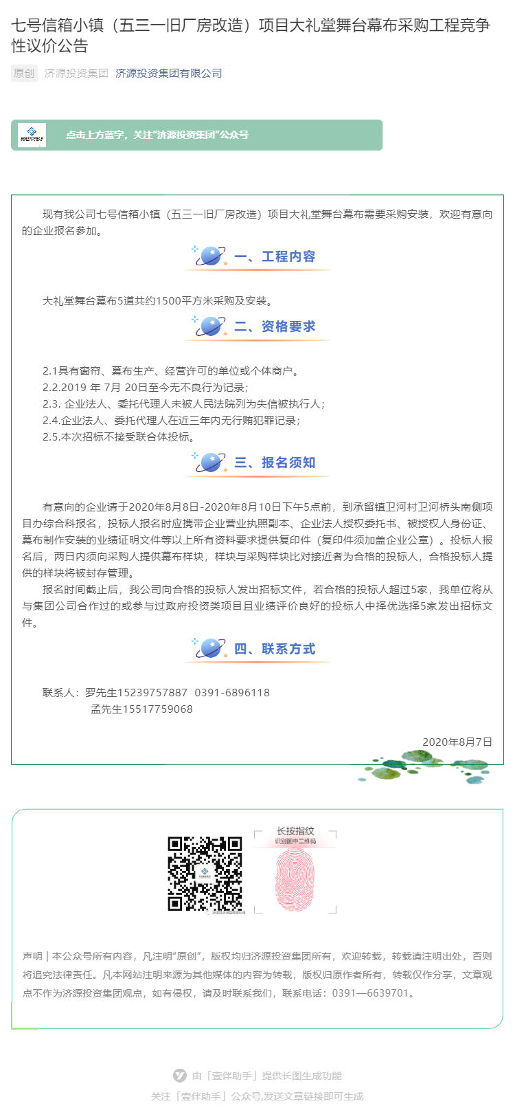 七號信箱小鎮(zhèn)(五三一舊廠房改造)項目大禮堂舞臺幕布采購工程競爭性議價公告