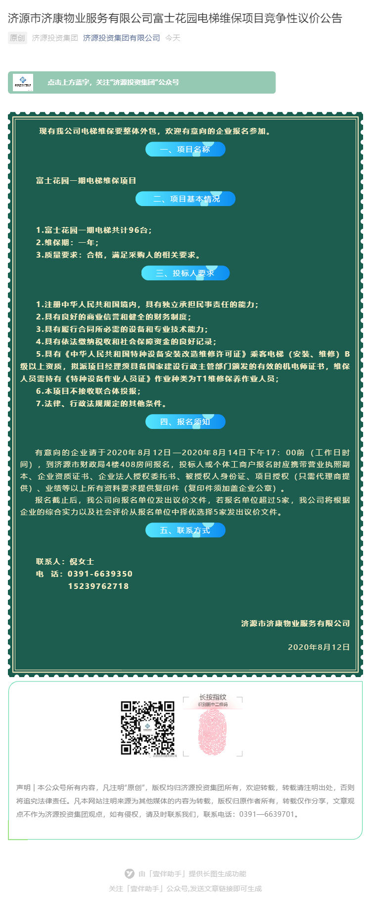 濟源市濟康物業(yè)服務有限公司富士花園電梯維保項目競爭性議價公告