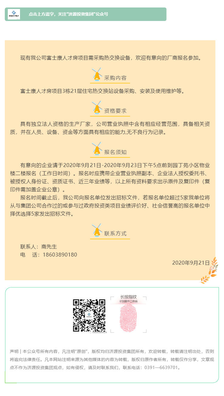 富士康人才房項目熱交換設(shè)備采購安裝競爭性議價公告