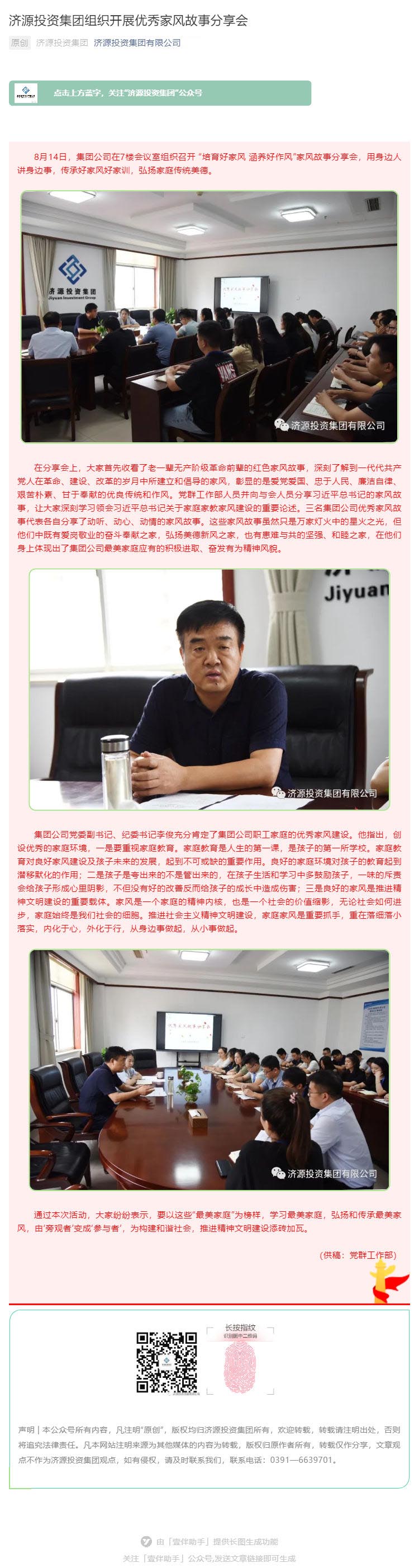 8月14日,濟(jì)源投資集團(tuán)在7樓會(huì)議室組織召開 “培育好家風(fēng) 涵養(yǎng)好作風(fēng)”家風(fēng)故事分享會(huì),用身邊人講身邊事,傳承好家風(fēng)好家訓(xùn),弘揚(yáng)家庭傳統(tǒng)美德。