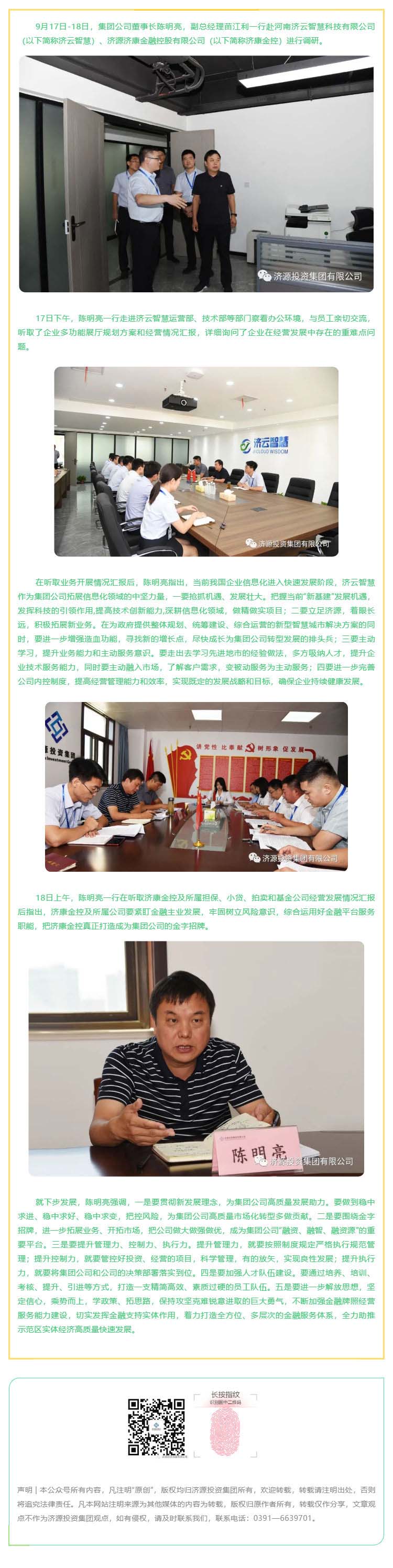 9月17日-18日,濟源投資集團董事長陳明亮,副總經(jīng)理苗江利一行赴河南濟云智慧科技有限公司(以下簡稱濟云智慧)、濟源濟康金融控股有限公司(以下簡稱濟康金控)進行調(diào)研。