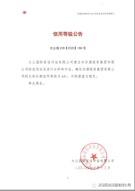 近日,國內(nèi)權(quán)威信用評級機(jī)構(gòu)大公國際資信評估有限公司通過對濟(jì)源投資集團(tuán)有限公司主體長期信用狀況進(jìn)行綜合分析和評估,確定公司主體長期信用等級為“AA+”,評級展望為“穩(wěn)定”,為我市市屬國有企業(yè)目前最高等級。