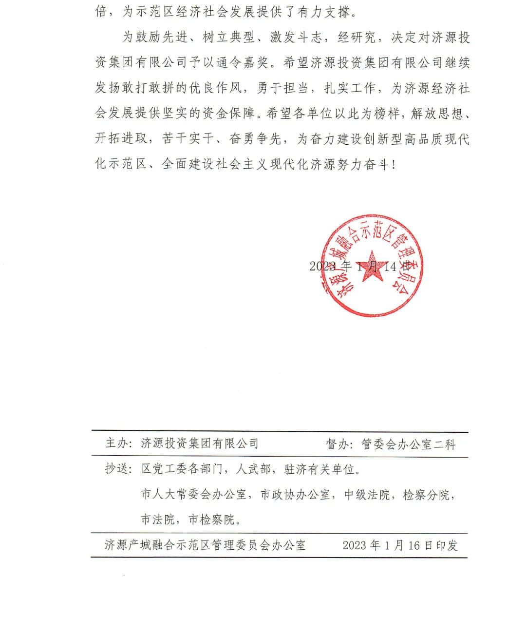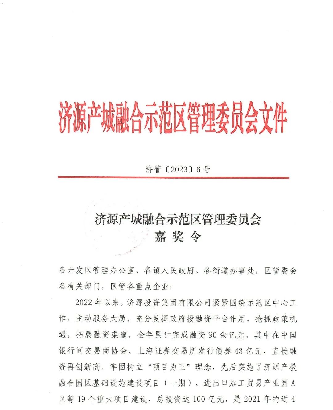 濟(jì)源產(chǎn)城融合示范區(qū)管理委員會(huì)各開發(fā)區(qū)管理辦公室、各鎮(zhèn)人民政府、各街道辦事處、區(qū)管委會(huì)各有關(guān)部門、區(qū)管各重點(diǎn)企業(yè):2022年以來(lái),濟(jì)源投資集團(tuán)有限公司緊緊圍繞示范區(qū)中心工作,主動(dòng)服務(wù)大局,充分發(fā)揮政府投融資平臺(tái)作用,搶抓政策機(jī)遇,拓展融資渠道,全年累計(jì)完成融資90余億元,其中在中國(guó)銀行間交易商協(xié)會(huì)、上海證券交易所發(fā)行債券43億元,直接融資再創(chuàng)新高。牢固樹立“項(xiàng)目為王”理念,先后實(shí)施了濟(jì)源產(chǎn)教融合園區(qū)基礎(chǔ)設(shè)施建設(shè)項(xiàng)目(一期)、進(jìn)出口加工貿(mào)易產(chǎn)業(yè)園A區(qū)等19個(gè)重大項(xiàng)目建設(shè),總投資達(dá)100億元,是2021年的近4倍,為示范區(qū)經(jīng)濟(jì)社會(huì)發(fā)展提供了有力支撐。? ??為鼓勵(lì)先進(jìn)、樹立典型、激發(fā)斗志,經(jīng)研究,決定對(duì)濟(jì)源投資集團(tuán)有限公司予以通令嘉獎(jiǎng)。希望濟(jì)源投資集團(tuán)有限公司繼續(xù)發(fā)揚(yáng)敢打敢拼的優(yōu)良作風(fēng),勇于擔(dān)當(dāng),扎實(shí)工作,為濟(jì)源經(jīng)濟(jì)社會(huì)發(fā)展提供堅(jiān)實(shí)的資金保障。希望各單位以此為榜樣,解放思想,開拓進(jìn)取,苦干實(shí)干,奮勇爭(zhēng)先,為奮力建設(shè)創(chuàng)新型高品質(zhì)現(xiàn)代化示范區(qū),全面建設(shè)社會(huì)主義現(xiàn)代化濟(jì)源努力奮斗!