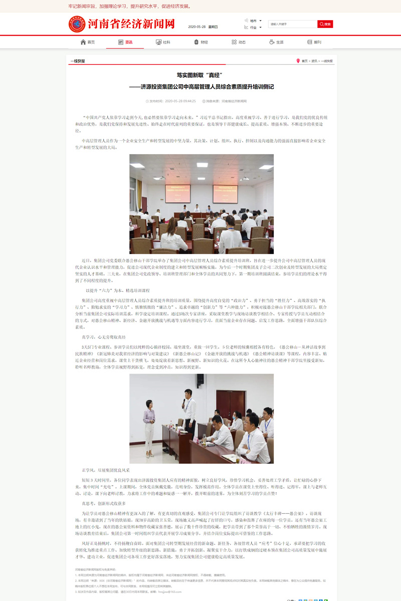 河南經濟新聞網:篤實圖新取“真經” ——濟源投資集團公司中高層管理人員綜合素質提升培訓側記
