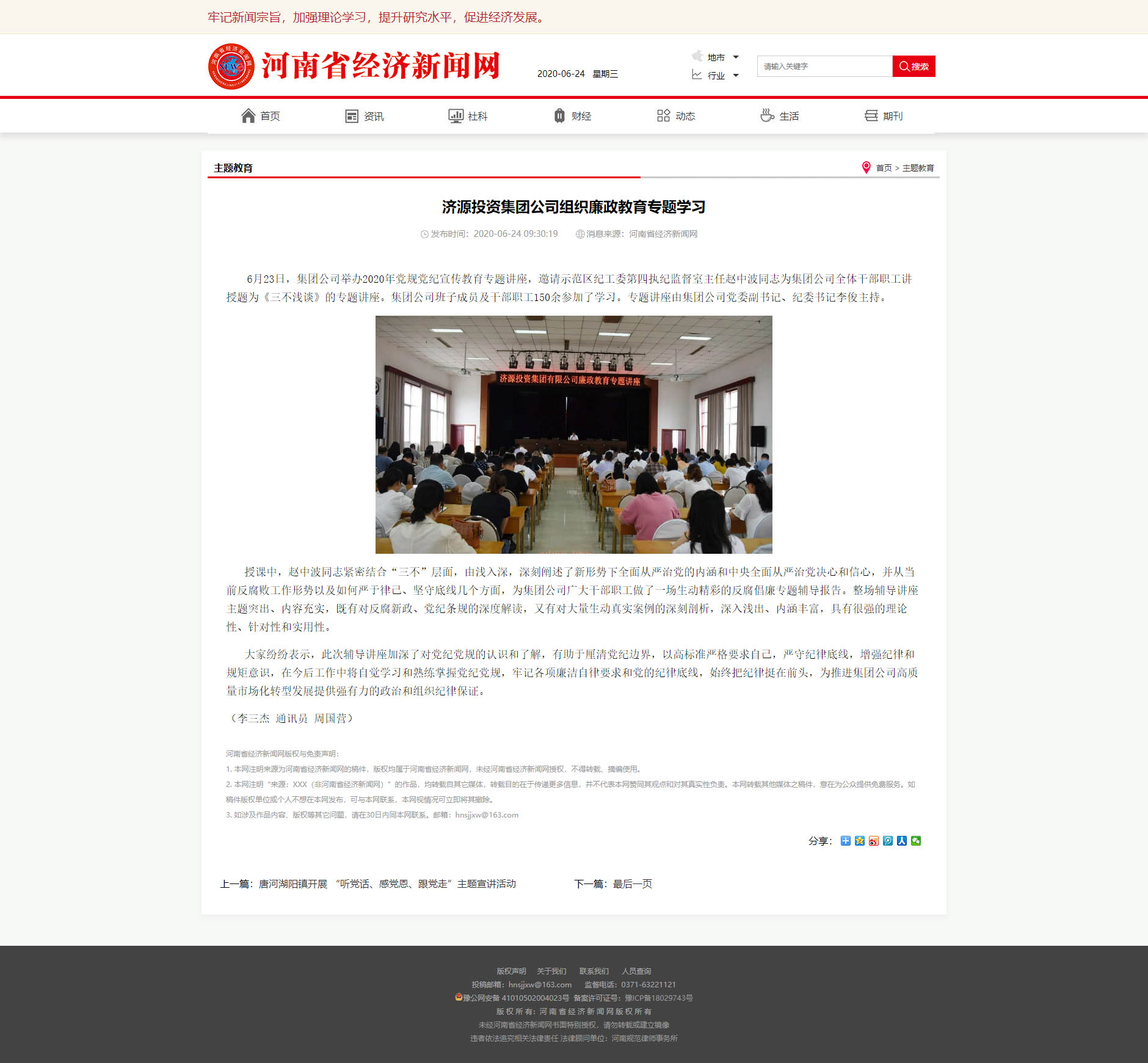 河南經濟新聞網:濟源投資集團公司組織廉政教育專題學習