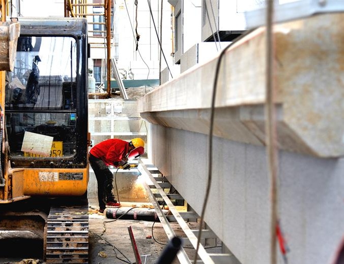 近日,記者來到濟(jì)源海關(guān)項(xiàng)目施工現(xiàn)場(chǎng),遠(yuǎn)遠(yuǎn)就看到一座簡(jiǎn)約又大氣的高樓,這就是即將完工的濟(jì)源海關(guān)綜合業(yè)務(wù)技術(shù)用房。高樓外墻的芝麻白花崗巖石材與赭色鋁板基本安裝結(jié)束,工人正在小心翼翼地安裝最后一根羅馬柱的干掛石材。